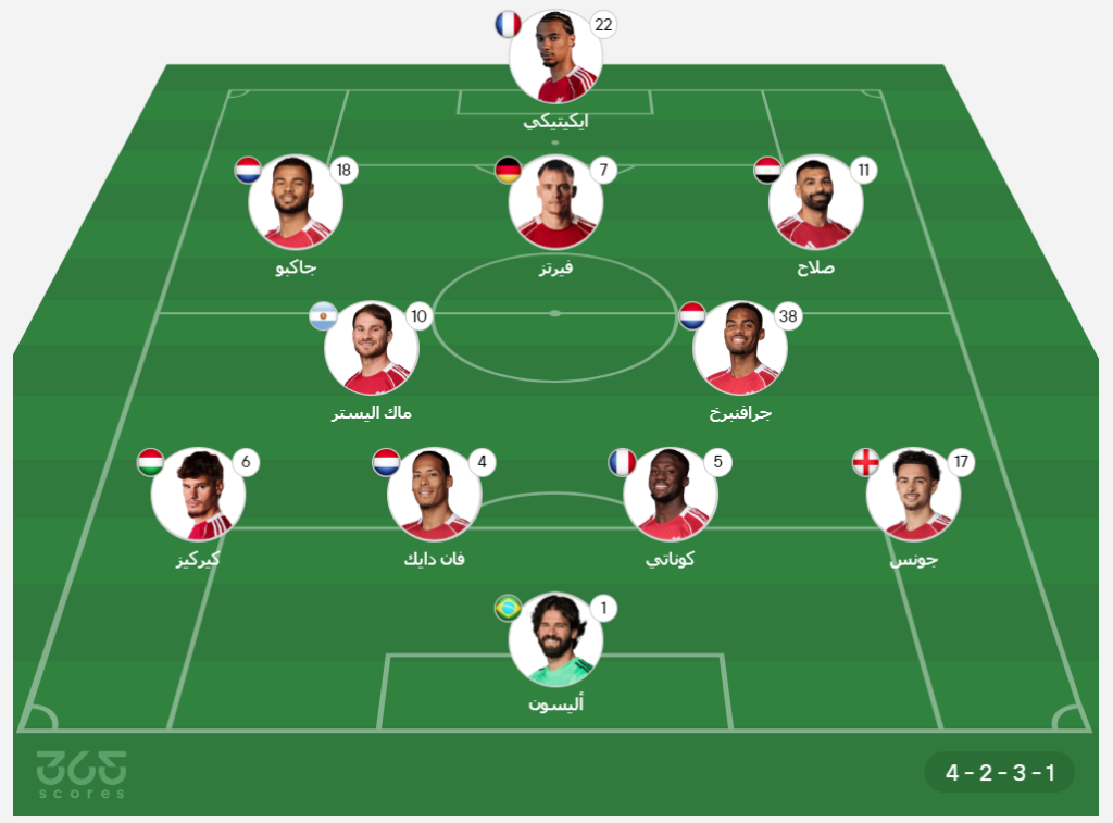 - خط الوسط الهجومي: كودي جاكبو، فلوريان فيرتز، محمد صلاح.